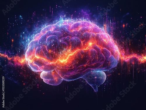 Stylized brain illustration featuring electrical impulses in vibrant colors and glowing effects
