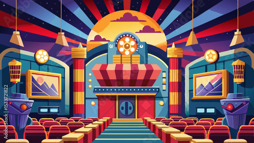 Stylized cartoon movie theater with red seats, grand stage, dramatic lighting and cinematic decor under a glowing sunset