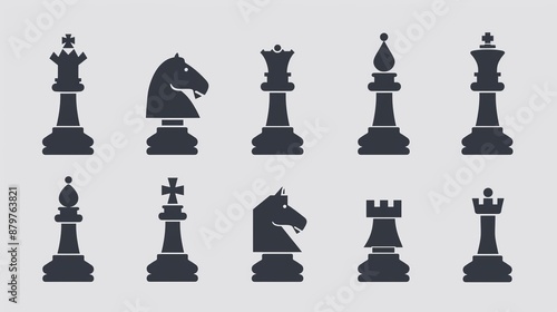 Stylized chess piece illustrations showing a mix of classic designs including kings, queens, knights, and rooks, with a light background adding contrast to the art.