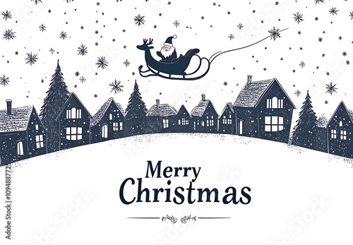 Stylized Christmas logo featuring Santa Claus flying in his sleigh with reindeer and a cat, surrounded by hand-drawn “Merry Christmas” lettering on a white background, perfect for holiday cards, banne