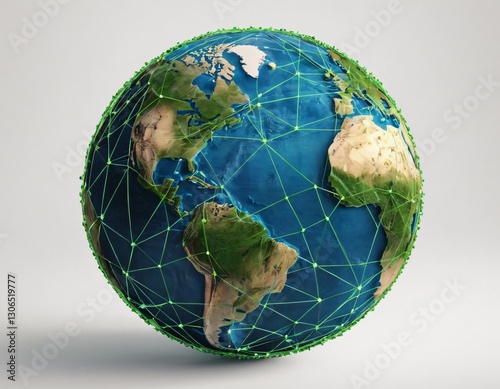 Stylized digital globe logo, featuring interconnected lines and dots to symbolize global connectivity and advanced technology, in cybernetic blue and digital green colors, white background