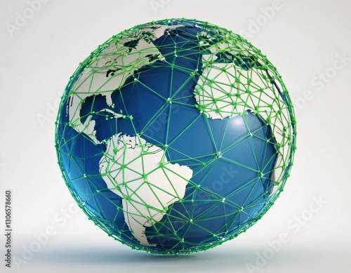 Stylized digital globe logo, featuring interconnected lines and dots to symbolize global connectivity and advanced technology, in cybernetic blue and digital green colors, white background