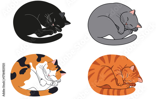 Stylized flat vector illustration of four different colorful sleeping cats