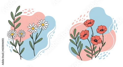 Stylized Floral Illustration Featuring Daisies and Poppies with Abstract Backgrounds