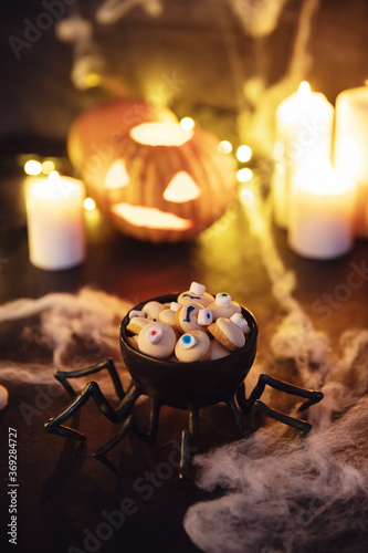 Stylized halloween sweet candies and cookies for holiday on dark background with cobwebs, pumpkins and candles
