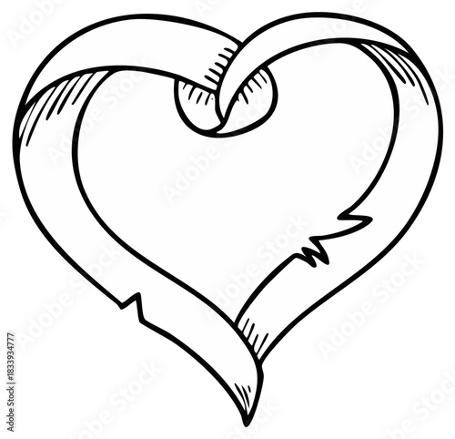 Stylized hand drawn heart shape made from a decorative ribbon banner outline doodle