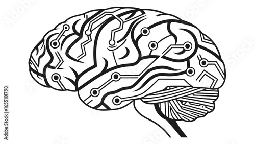 Stylized human brain illustration with circuit board patterns in black and white design concept created with generated ai