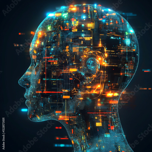 Stylized Human Head Composed of Glowing Data Streams
