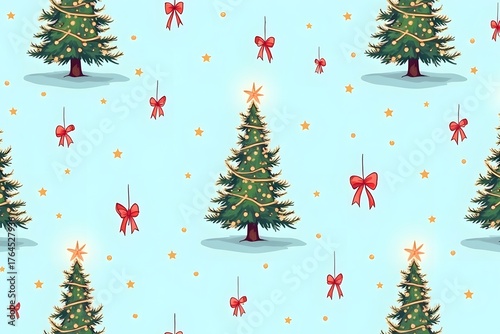 stylized illuminated simple pattern with hand drawn Christmas trees decorated ribbons, bows and ornaments on light blue background