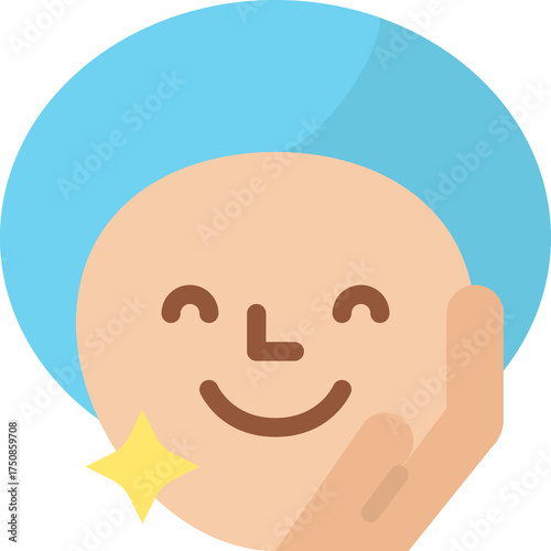Stylized illustration of a smiling person with closed eyes and light blue hair wearing a shower cap touched