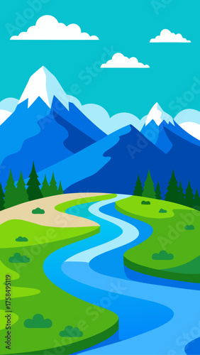 Stylized illustration of a winding river flowing through green meadows towards snow capped mountains under a blue sky with clouds