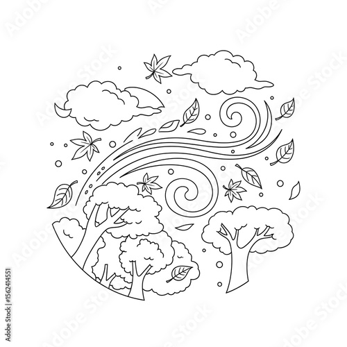 Stylized illustration of autumn trees and falling leaves in a circular composition isolated on transparent background