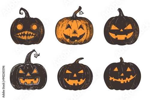 Stylized jack-o'-lantern set with black and orange pumpkins featuring spooky expressions and distressed textures