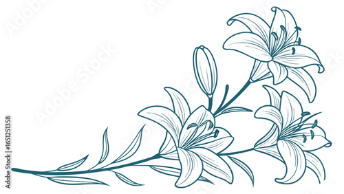 Stylized Line Drawing Of Blooming Lily Flowers And Leaves floral botanical