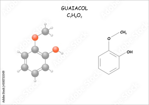 Stylized molecule model/structural formula of guaiacol. Use in perfume industry and for synthesis.