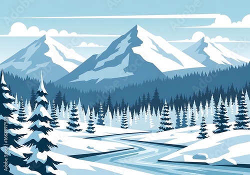Stylized panoramic vista of a pristine winter landscape featuring snow clad mountains