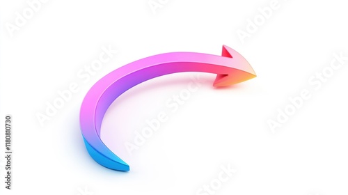 Stylized rainbow gradient 3D arrow curving smoothly, beautifully isolated on a white background.