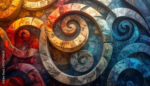 Stylized spirals with a stone-like texture, transitioning from warm hues on the left to cool blues on the right