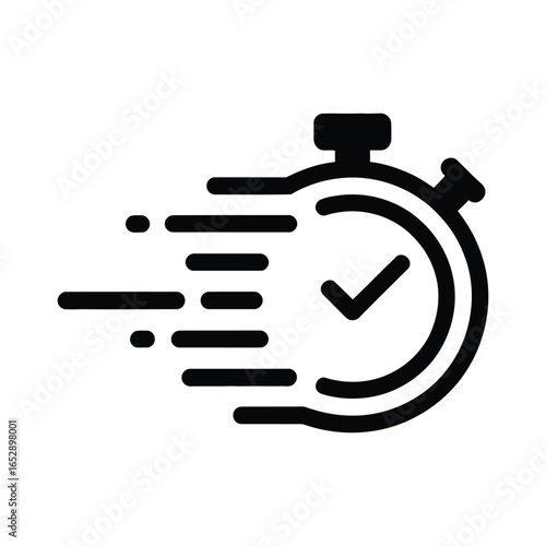Stylized stopwatch icon with motion lines and check mark—black silhouette symbolizing speed, efficiency, and completed tasks