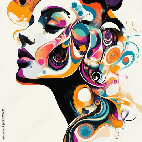 Stylized Vector Illustration of a Woman's Face Blended with Abstract Swirls and Vibrant Shapes