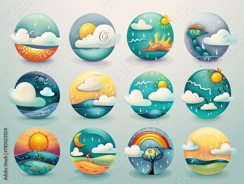 Stylized weather icons set against a backdrop of corresponding weather scenes