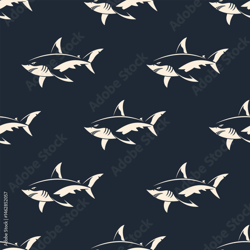 Stylized white sharkes on dark blue background. Vector seamless pattern.