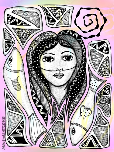 Stylized woman surrounded by fish and geometric tribal shapes on soft pastel pink and yellow background symbolizing harmony femininity and water energy in delicate digital mixed media composition
