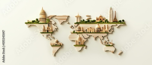 Stylized world map with iconic landmarks depicting architecture and nature, set against a white background.
