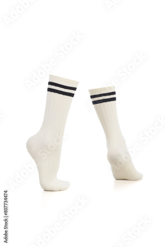 Subject shot of white shadow-proof socks with two black stripes on the rim. The photo is made on the white background. Side view.