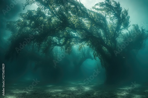 Submerged kelp forest creates an ethereal underwater landscape, resembling ancient trees in a mystical realm.