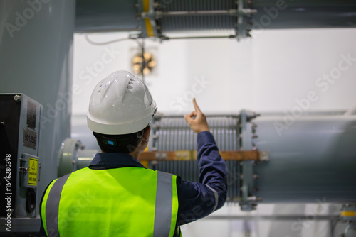 Substation engineer inspects gas insulated switchgear equipment carefully pointing at components in industrial electrical substation ensuring safety and operational standards