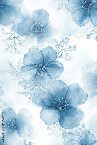 Subtle Azure Bloom: Delicate watercolor artwork showcases a seamless pattern of soft blue flowers with detailed petals and leaves. Evokes feelings of calm.