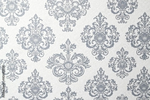 Subtle damask pattern with muted gray on white linen-like surface, seamless, white