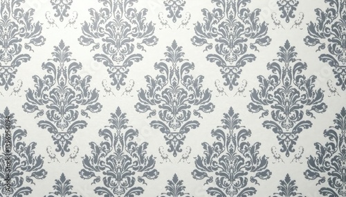 Subtle grayscale damask, repeating arabesque design on linen texture , seamless, simple