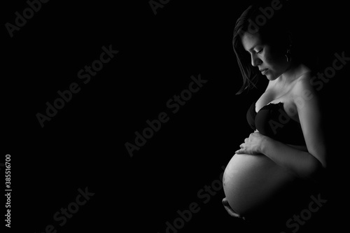 Subtle light revealing pregnant woman, holding belly with two hands
