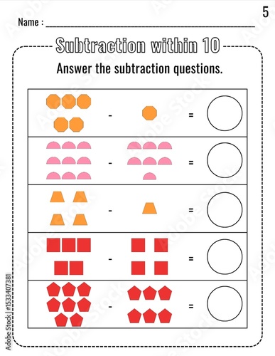 Subtraction Within 10 with Colorful Shapes – Math Worksheet for Children I Printable