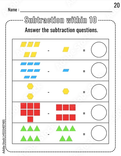 Subtraction Within 10 with Colorful Shapes – Math Worksheet for Children I Printable