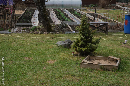 Suburban area with a sandbox, a tree, a lawn.