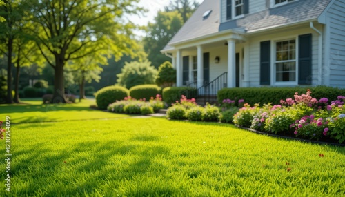 Suburban Dream Home: Lush Green Lawn and Vibrant Flower Beds