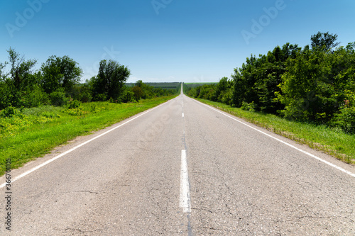 suburban empty road asphalt surrounded by trees and grass. The concept of transportation and travel. Background green grass asphalt and blue sky