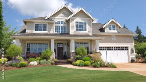 Suburban Home Exterior with Landscaped Yard and Blue Sky, Featuring a Two-Story Design