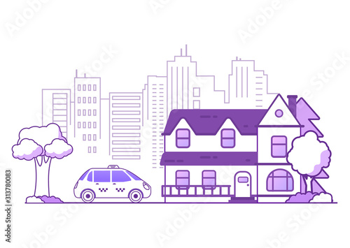 Suburban house in the forest. Country cottage. Rural villa. Flat vector illustration. Concept for sale of buildings.Online taxi service.City silhouette outline with skyscrapers.car