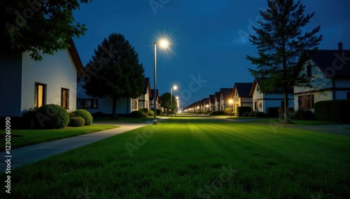Suburban lawn with minimal streetlights and clear night sky, calm, night, dark