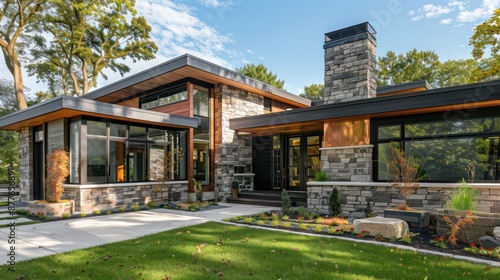suburban mid-century modern home with an exterior that features natural stone cladding and copper accents, blending modern and rustic elements