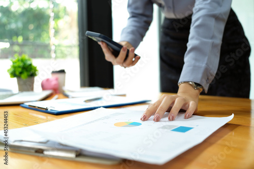 Success businesswoman working, looking at financial report and holding smartphone