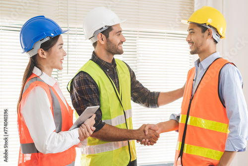 Success deal, Meeting and greeting for project of partner. Construction engineering, architect worker team or partnership hands shaking, handshake after agreement in office site, collaboration concept
