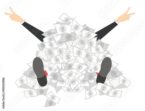 Success in business. Gambling. Lottery. Hands with victory or winning gesture rise from the big pile of money. Man lying under a pile of money