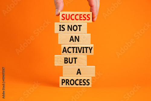 Success in process symbol. Wooden blocks with words Success is not an activity but a process. Beautiful orange background, copy space. Businessman hand. Business, success in process concept.