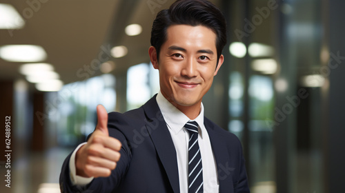 Successful Asian businessman rejoices looking at camera shows thumbs up and signs ok. Business Concept.
