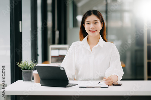 Successful Asian Businesswoman Analyzing Finance on Tablet and Laptop at modern Office Desk tax, report, accounting, statistics, and analytical research concept.